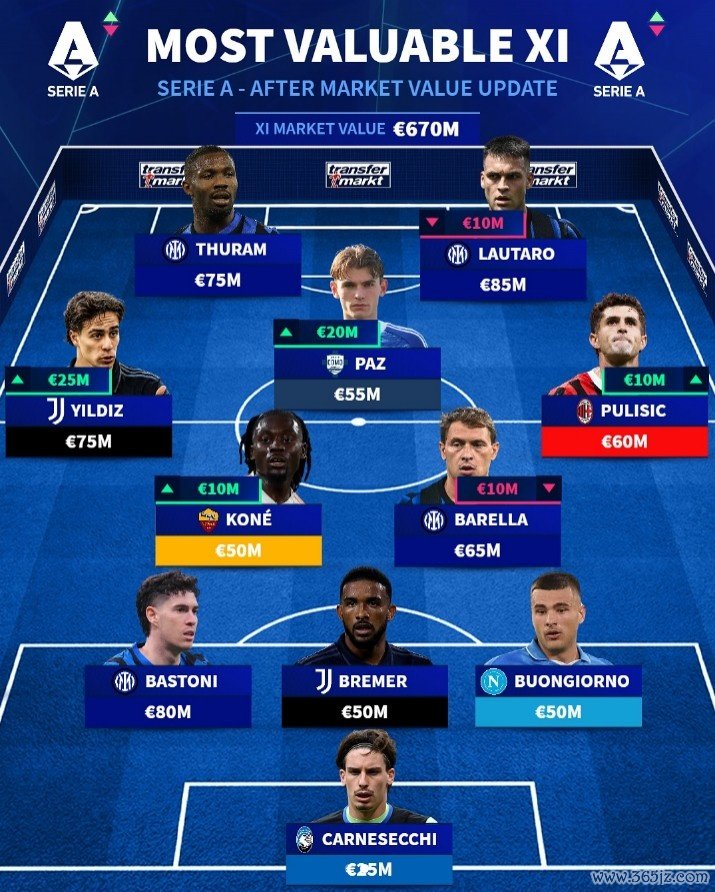 10月8日讯 德转更新了球员身价名次,意甲最贵首发11东谈主也随之出炉,国米的劳塔罗和图拉姆领衔锋线,AC米兰球员普利西奇入选。