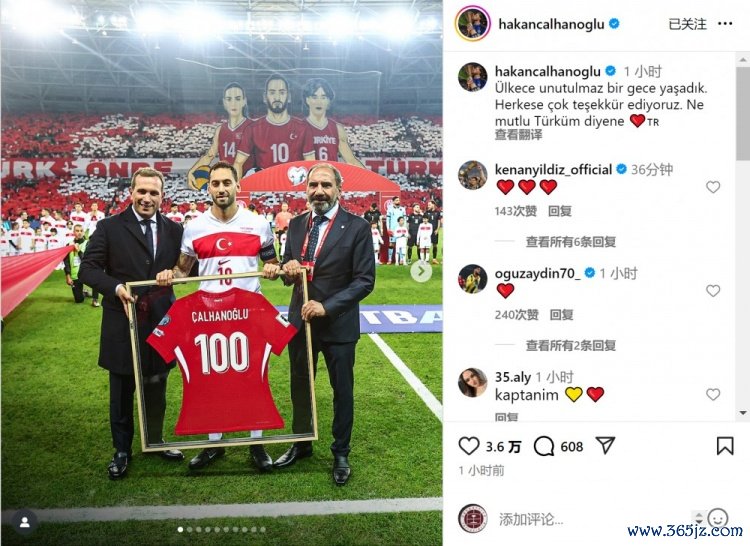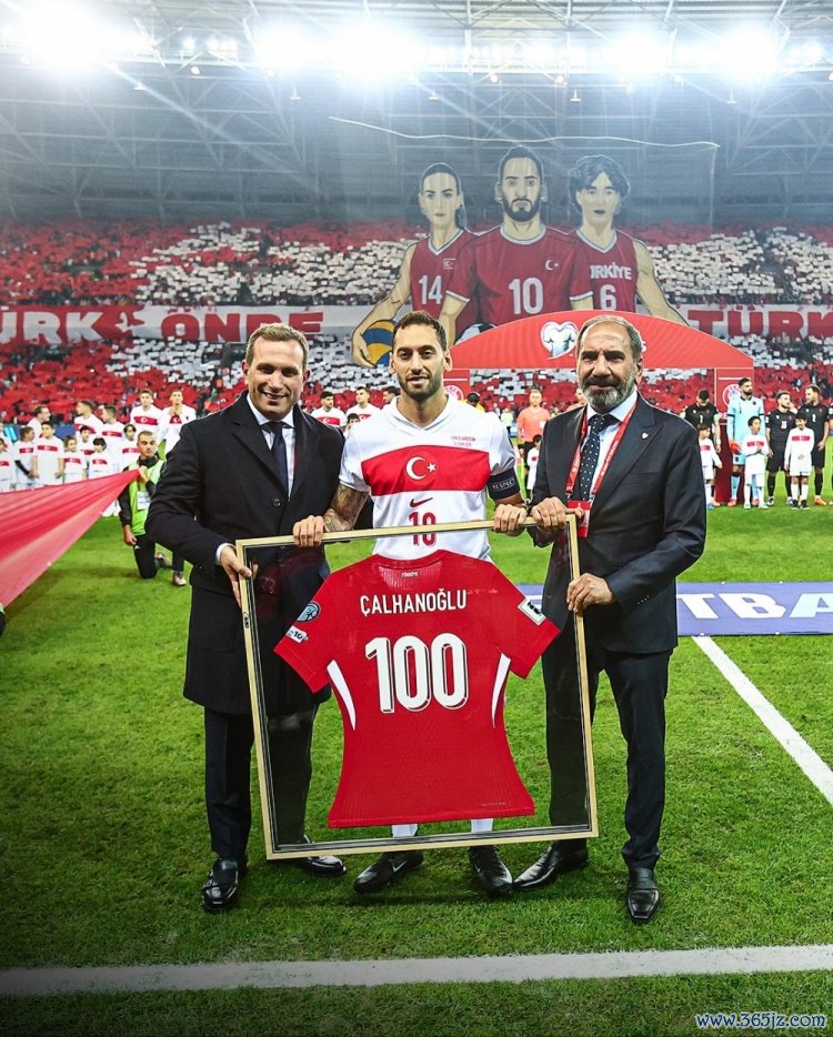 恰尔汗奥卢在对阵保加利亚的比赛中杀青国度队出战100场里程碑,此役赛前土耳其队向他颁发了记挂球衣。