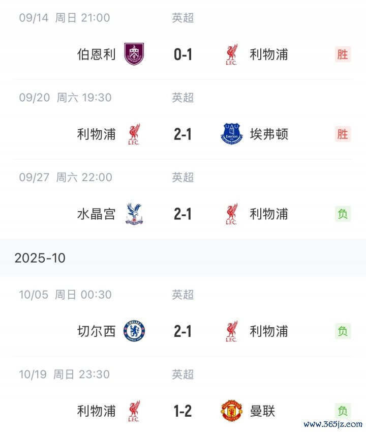 利物浦第五轮时一度跨越阿森纳5分,随后先后不敌水晶宫、切尔西和曼联,联赛名次掉至第四过时榜首4分。