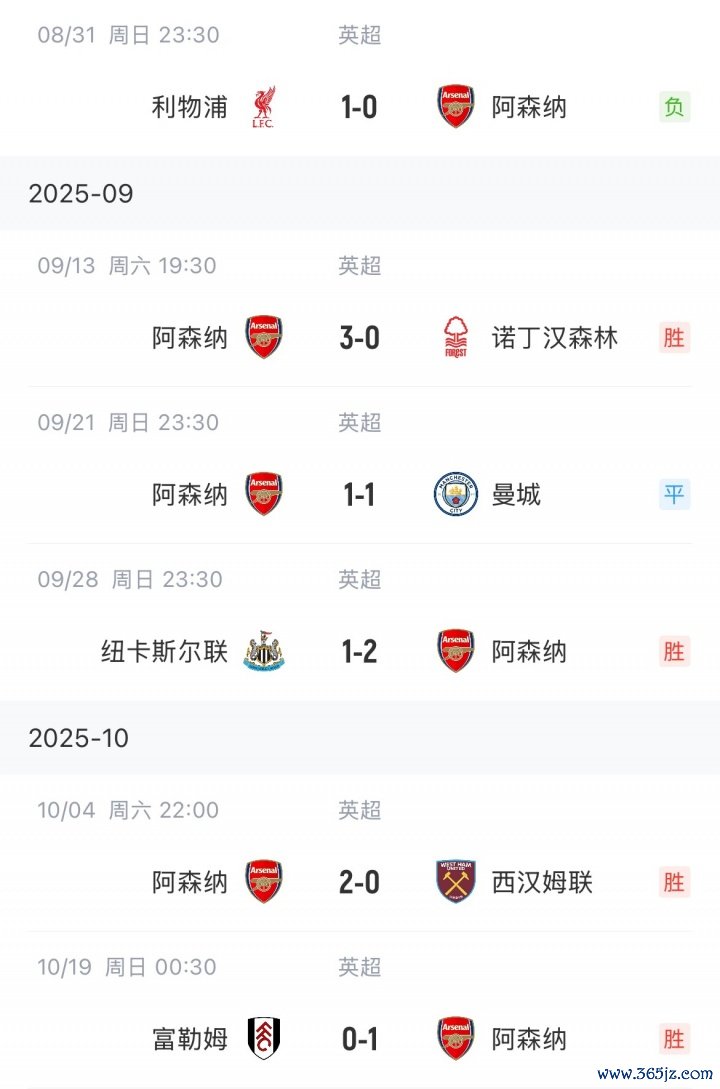 阿森纳联赛主场战平曼城后获取三连胜,如今以3分上风领跑。