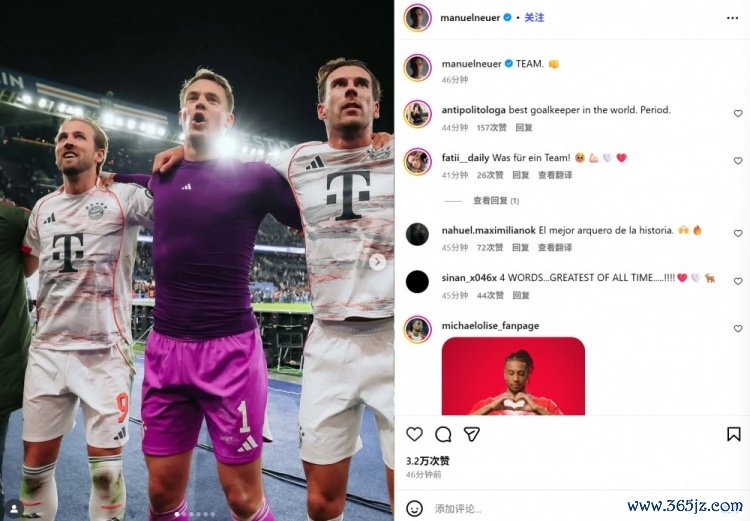 11月5日讯 拜仁在本轮欧冠焦点战2-1力克巴黎,诺伊尔在赛后通过社媒庆祝班师。