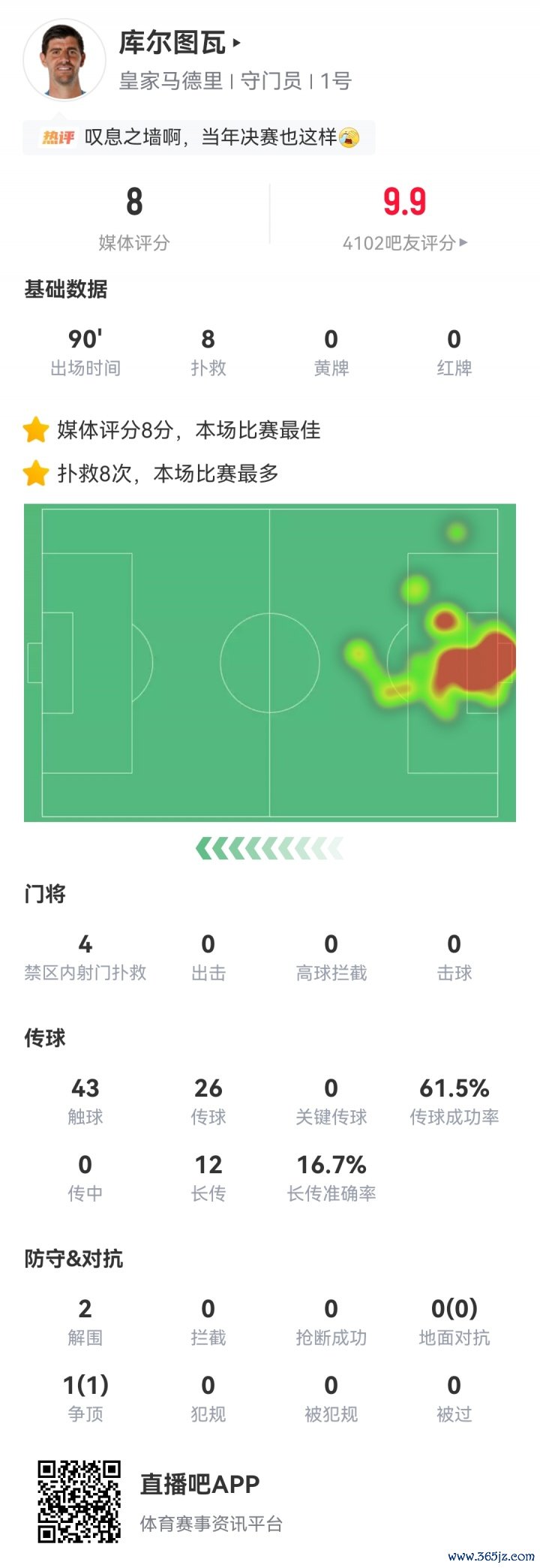 赛后评分机构Sofascore晒出了两位门将的评分,诺伊尔8.2分,库尔图瓦8.0分。
