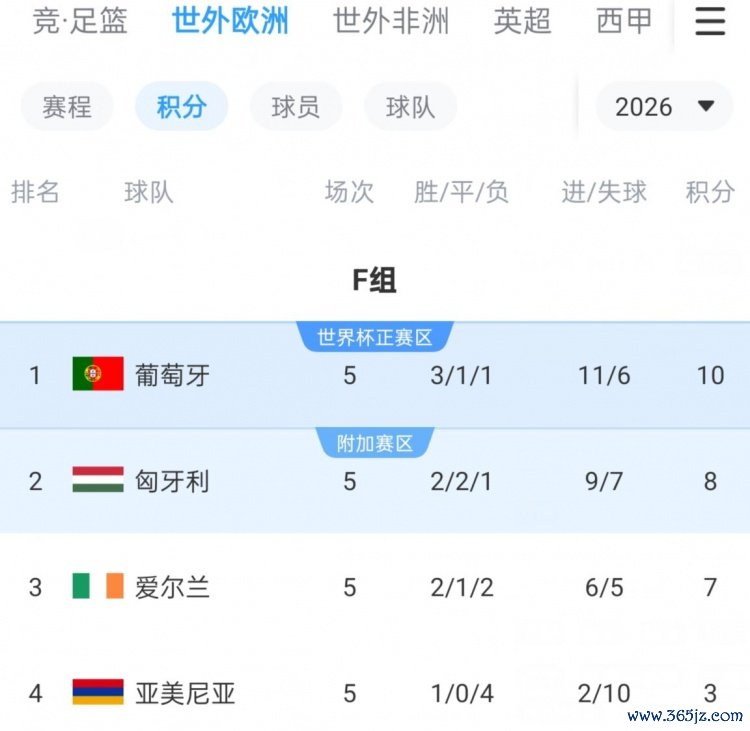 世初赛欧洲区小组赛F组现在的积分场面如下: