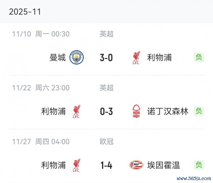 11月27日讯 欧冠联赛阶段第5轮,利物浦主场1-4不敌埃因霍温,各项赛事3连败!