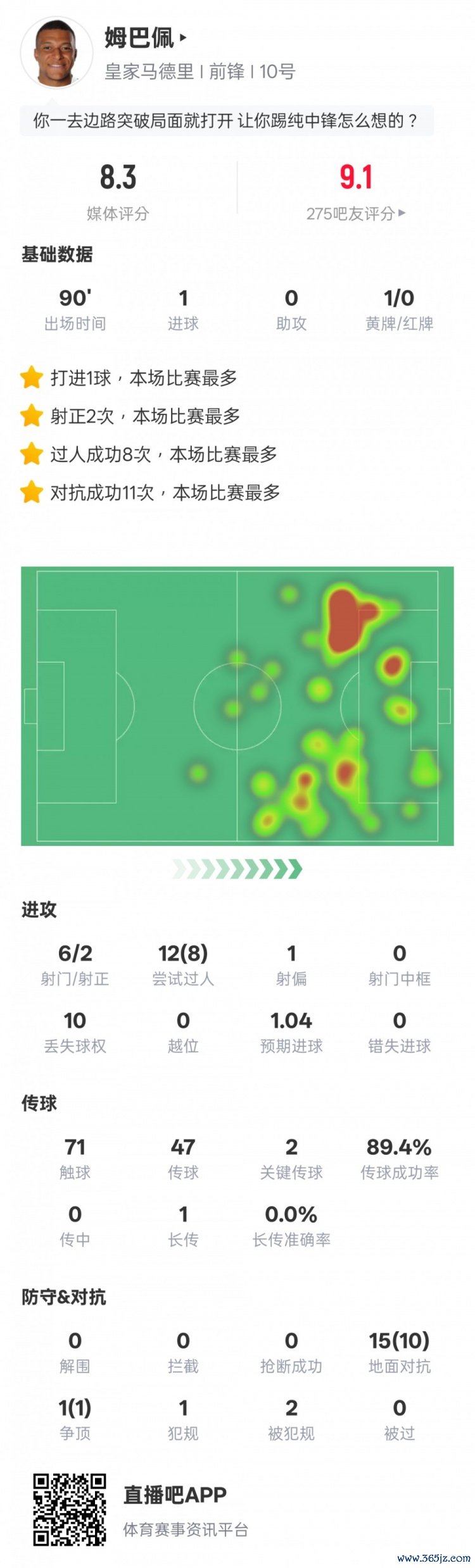 8月20日讯 2025-26赛季西甲首轮,皇马1-0驯服奥萨苏纳,姆巴佩首发出战,造点+点射,另外还有8次过东谈主告捷,评分8.3。