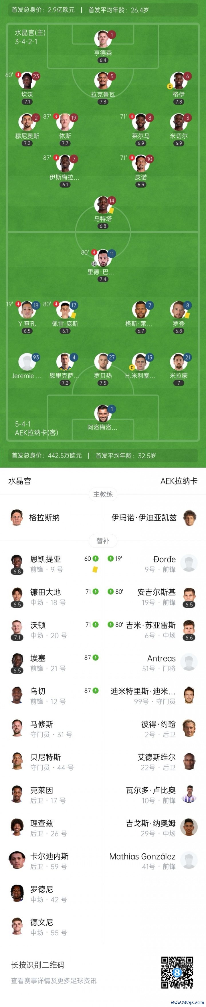 本场比赛,水晶宫队派出大部分主力出战,首发11东说念主总身价高达2.9亿,而敌手首发11东说念主总身价仅为442.5万欧,水晶宫的首发身价是敌手的65倍。