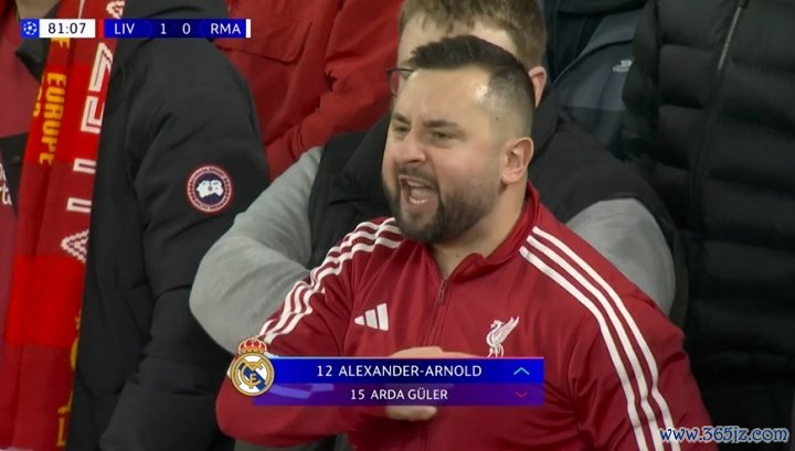 11月05日讯 利物浦vs皇马第81分钟,阿诺德登场换下居莱尔,安菲尔德嘘声震天!