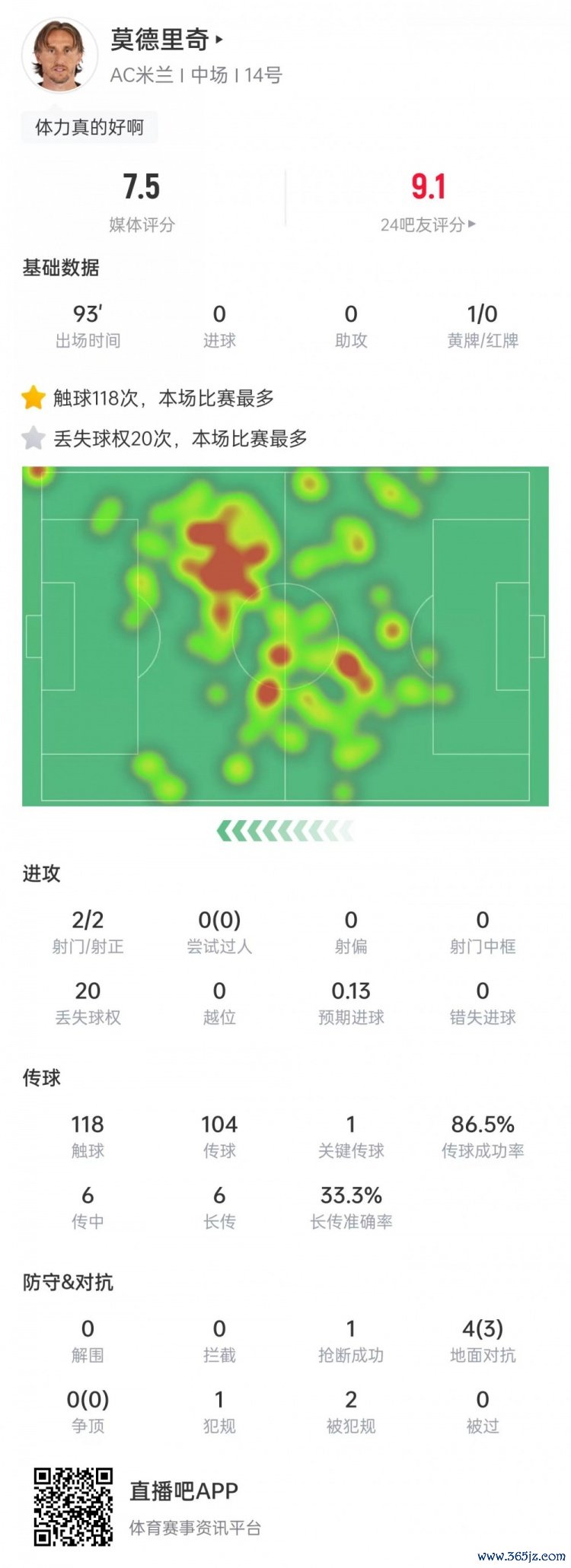 莫德里奇数据:触球118次全场最多,4次抵挡3次顺利,获评7.5分