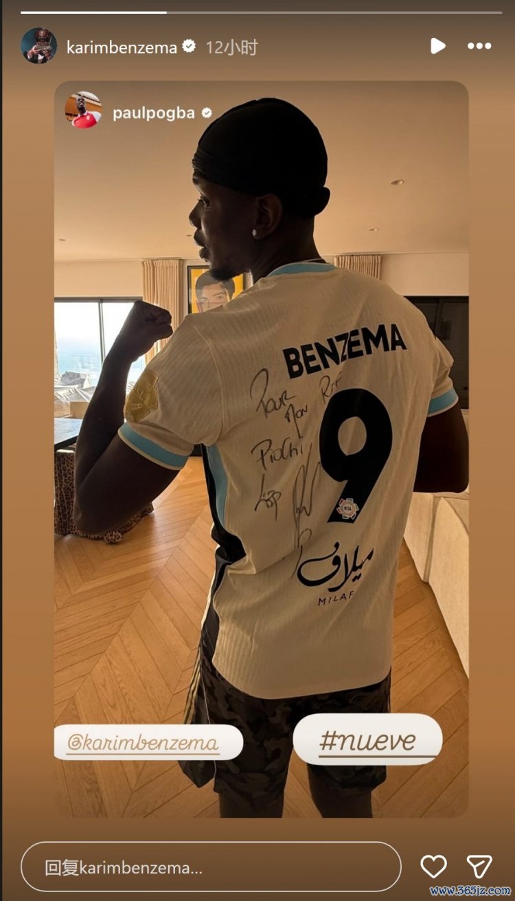 博格巴社媒晒身穿本泽马签名球衣相片,本泽马转发动态