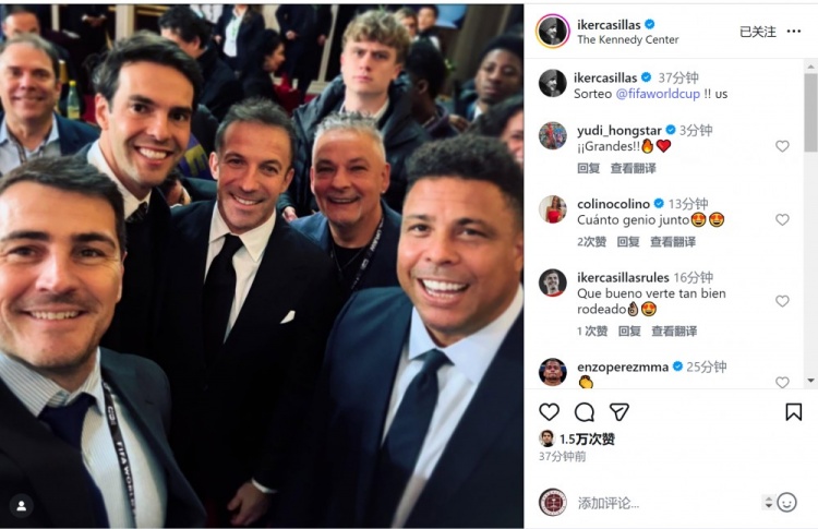 卡西出席天下杯抽签典礼,他在外交媒体上晒出与大罗、卡卡、皮耶罗、巴乔的合照。