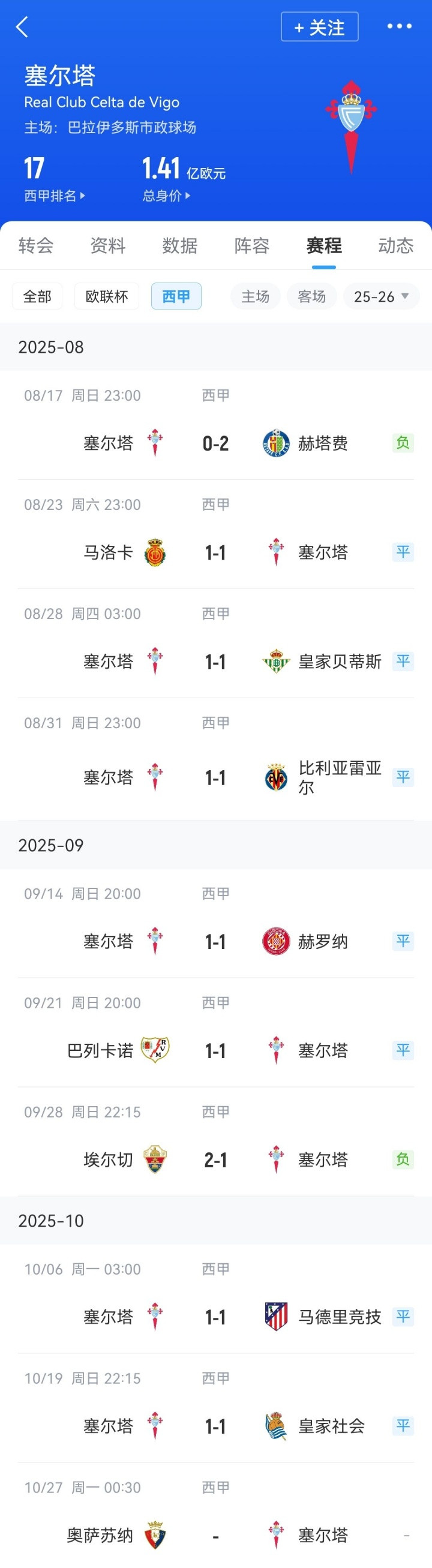 塞尔塔新赛季联赛战绩↓