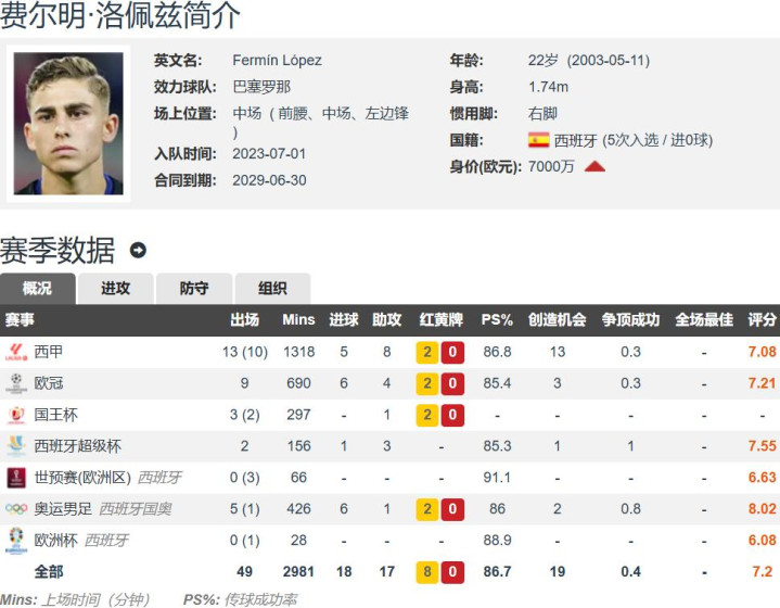 而费尔明稳扎稳打,一步一步成为巴萨在前腰的重要球员,本赛季更是输出稳定,各项赛事39场12球16助,早早交出了准两双数据,创下个人职业生涯加入 得分 数据的新高,身价也从3年间翻了12.5倍,从800万欧元一路飙涨至1亿欧元,西甲目前的八大亿欧之一。