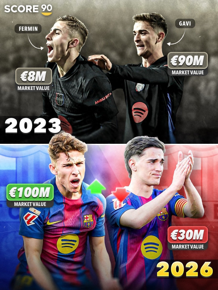 费尔明和加维都出自拉玛西亚青训,因此两人从小就是队友。2021年,当时17岁的加维在巴萨是横空出世,一鸣惊人,快速成为球队主力中场球员;费尔明直到2023年也就是球员20岁时才升入巴萨一线队,当时加维的身价已经高达9000万欧元,大部分球迷和媒体认为加维就会是巴萨新的“亿欧先生”,而当时费尔明的身价仅有800万欧元。