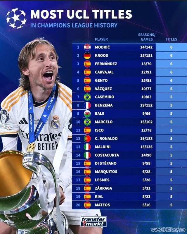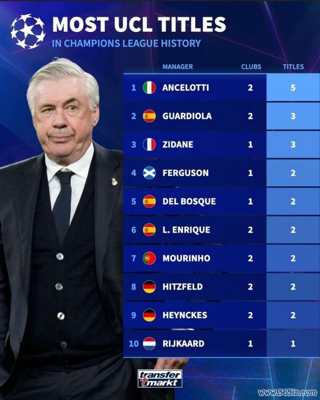 欧冠夺冠次数榜:证实安切洛蒂5冠居首,球员魔笛等5东说念主斩获6冠