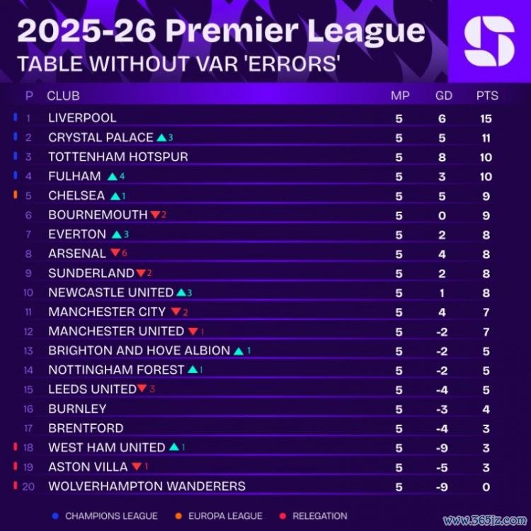 Squawka官推写谈:“本赛季,咱们每轮比赛后齐会邀请球迷们对最具争议的VAR判罚进行投票。以下是第5轮比赛后,摒除VAR误判影响的英超积分榜情况。”