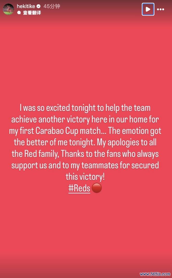 在与南安普顿的英联杯比赛中因脱衣庆祝染红后,利物浦时尚埃基蒂克在酬酢媒体发文谈歉。