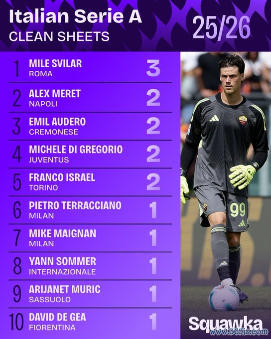 虎扑09月25日讯Squawka数据统计,罗马门将斯维拉尔在2025年的24场意甲比赛中完成了14场零封,这一数据比其他意甲门将齐至少多出3场。