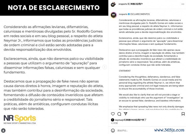 RodolfoGomes发布视频后,这些音书就在巴西媒体和推特上疯传,内马尔方面也作念出了反馈,他的经纪公司NRSports今早发布声明,示意RodolfoGomes分布流言有损内马尔的形象和名誉,将对其进行告状。