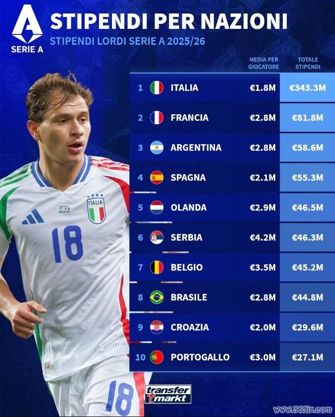 德国转会市集对意甲球员的薪资情况进行了清点,意大利球员总薪资最高,而塞尔维亚球员的平均年薪最高的。