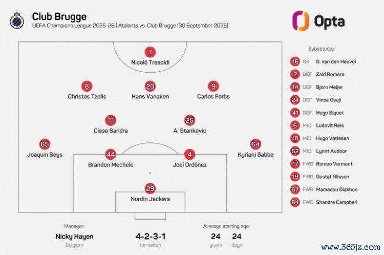 24岁24天!布鲁日排出欧冠历史平均年级最年青首发声势