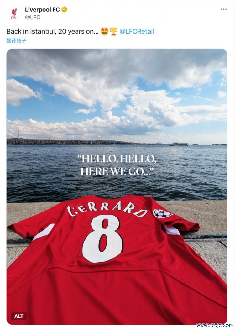 北京时间10月1日3点,欧冠联赛阶段第二轮,利物浦客战加拉塔萨雷。利物浦官方晒出一件在海边的杰拉德球衣,同期配文:20年后重回伊斯坦布尔。