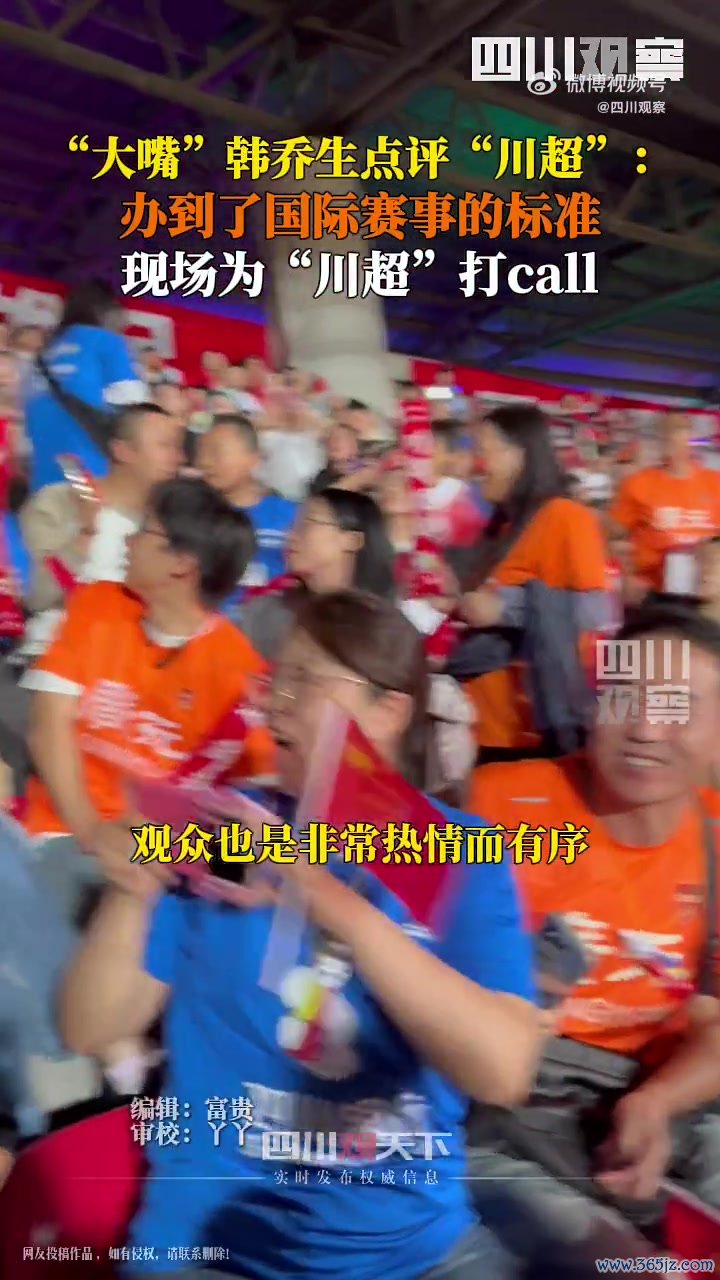 韩乔生说谈:“第一我以为即是赛事组织相称可以,纪律井然,不雅众也曲直常温雅有序,从球员入场到赛事组织,包括到草地的灯光草坪,通盘这个词四川在大型赛事的组织才气可以说达到了国外赛事的规律。川超雄起!中国雄起!”