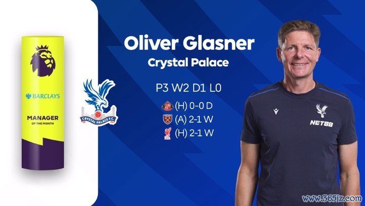 10月10日讯 奥地利籍主帅奥利弗-格拉斯纳九月率水晶宫保捏不败,当选英超月度最好主帅,生活首获该奖项。