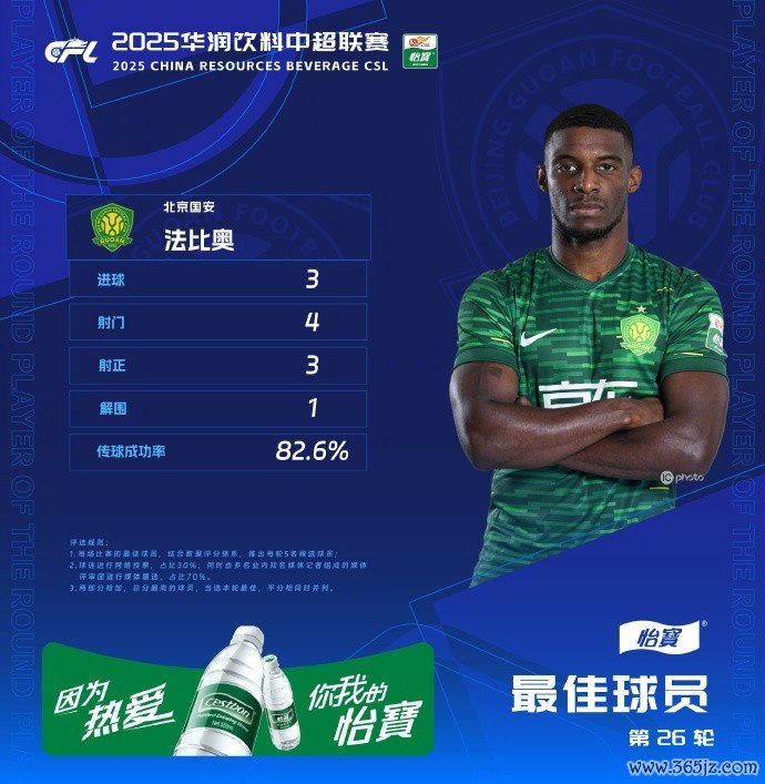 官方:对阵大连英博戴帽,国安时尚法比奥当选中超第26轮最好球员