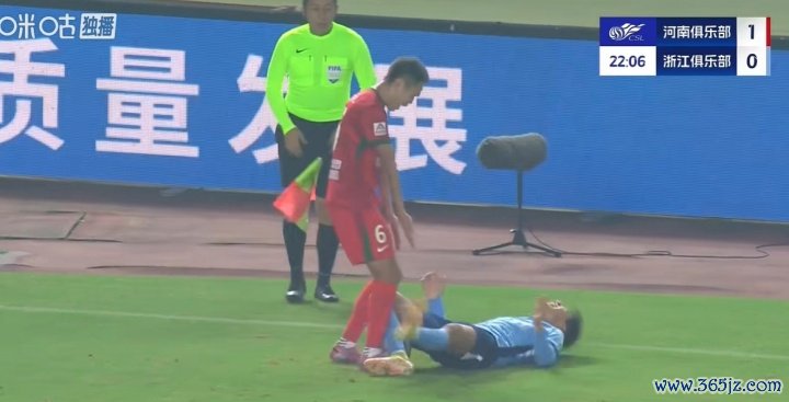10月25日讯 河南vs浙江第23分钟,张瑷晖倒地夹住皮球,王上源上去对着皮球一通踢。
