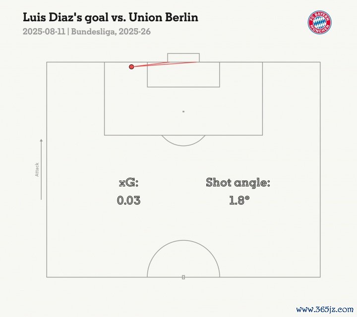 叹为不雅止!迪亚斯小角度圣人球预期进球仅0.03,射门角度1.8°