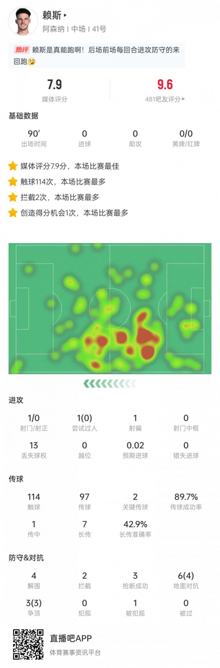 #英超# 赖斯数据: 触球114次全场最多, 9次抵拒7次得胜, 评分7.9全场最高
