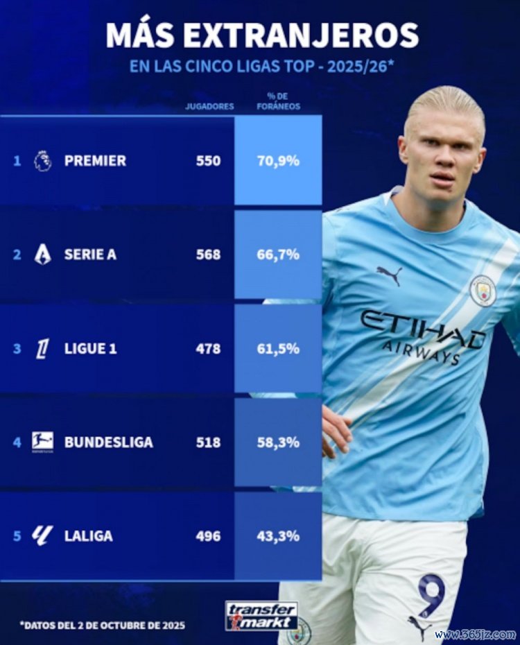 10月14日讯 凭证德国转会阛阓的数据,本赛季五大联赛英超外籍球员占比最高,西甲外籍球员占比最低。