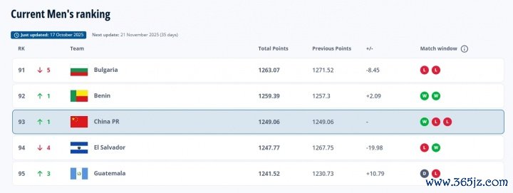 10月17日讯 FIFA更新男足国度队排行,10月国度队比赛日莫得集训的中国男足排行高涨一位,从第94位升至第93位。