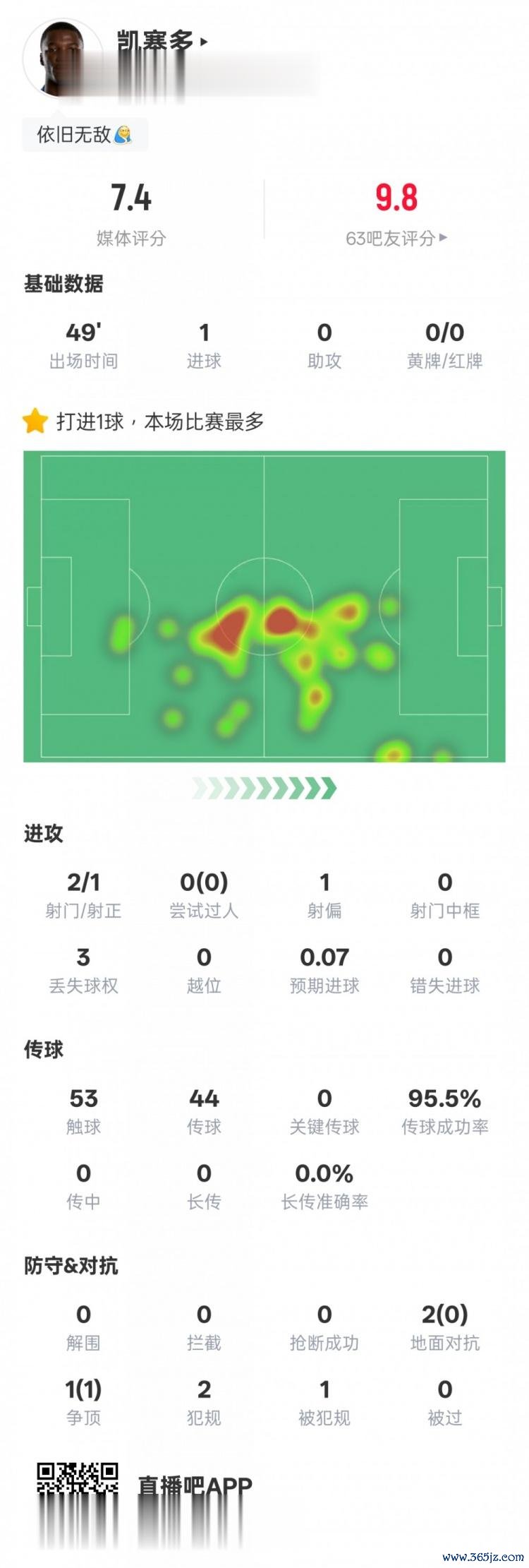 凯塞多本场比赛数据: 1射正1进球+传球奏遵循95.5%, 评分7.4