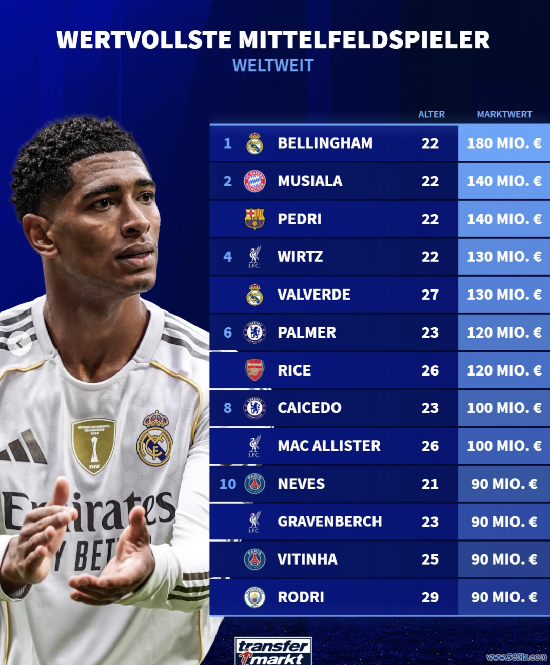 皇马的贝林厄姆以1.8亿欧居首,穆夏拉和佩德里以1.4亿欧比肩第二。