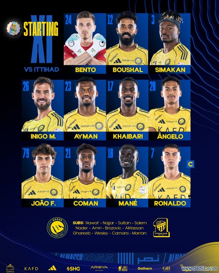 利雅得告捷首发:24- 本托、12-纳瓦夫、3-西马坎、26-伊尼戈·马丁内斯、23-叶海亚、17-哈巴利、20-安吉洛、79-菲利克斯、21-科曼、10-马内、7-C罗