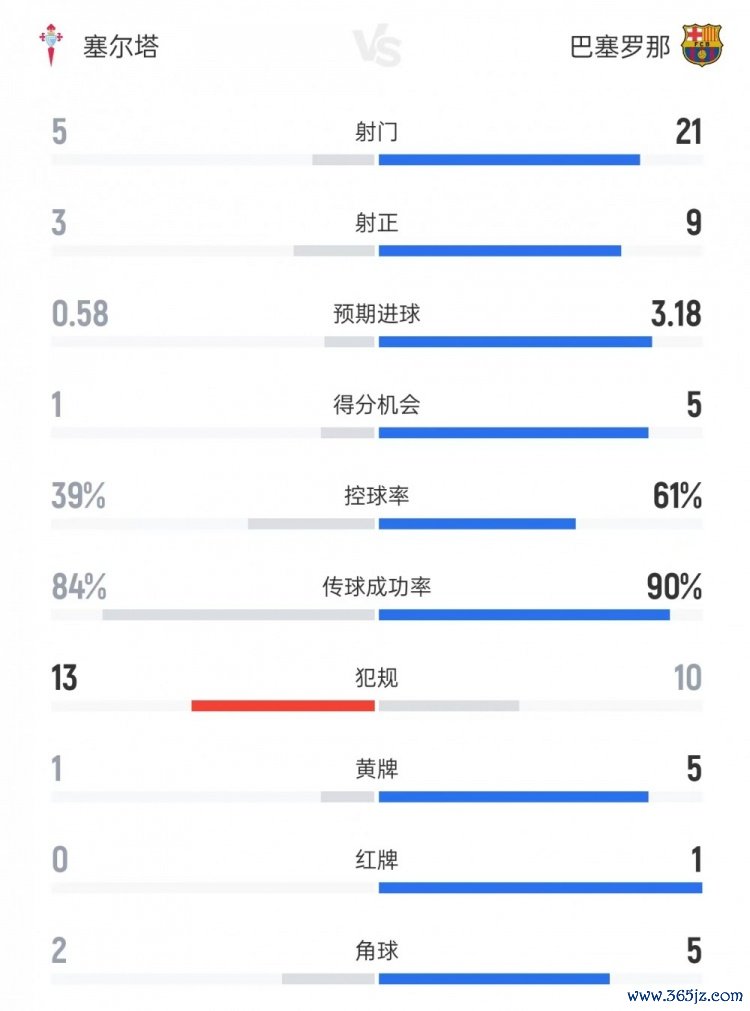 巴萨vs塞尔塔全场数据:射门21比5、射正9比3、控球率61%比39%