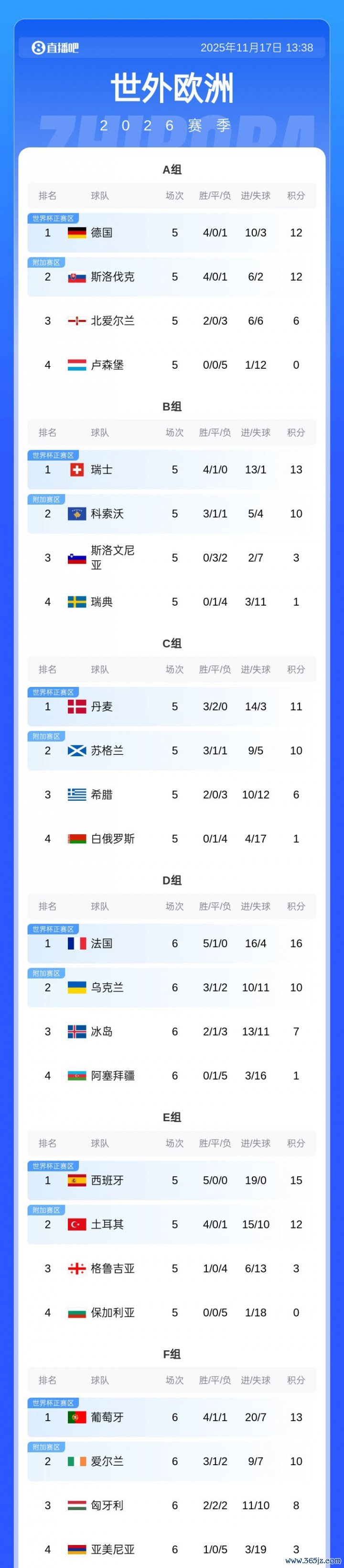 世初赛欧洲区预选赛小组赛行将落幕,现在16个纵贯限额中,英格兰、法国、克罗地亚、葡萄牙、挪威仍是出线,还有哪些球队有晋级契机?哪些球队参加附加赛?哪些球队仍是出局?让咱们一酌量竟。